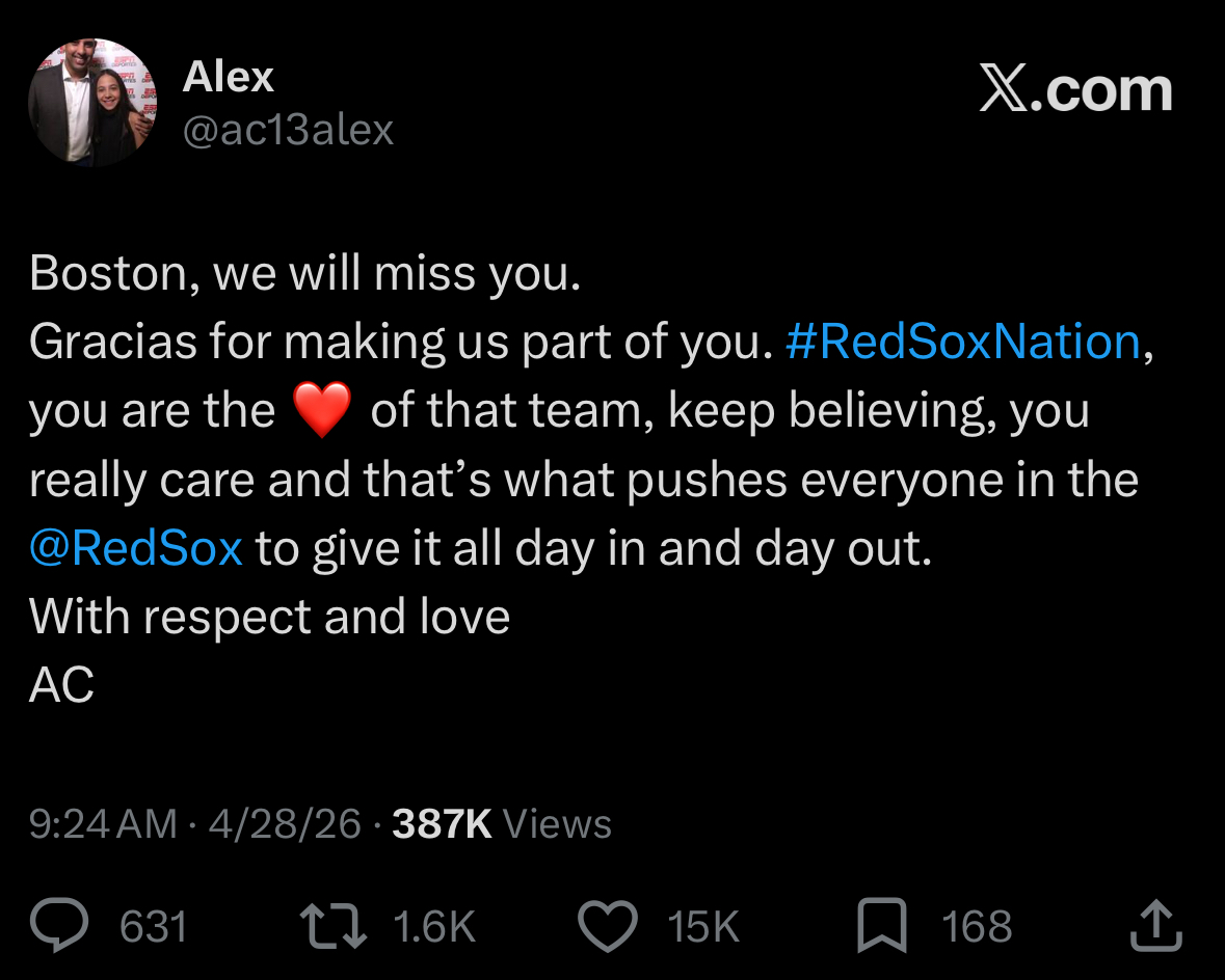 / 2 hours agoAlex Cora posts farewell message to Red Sox Nation