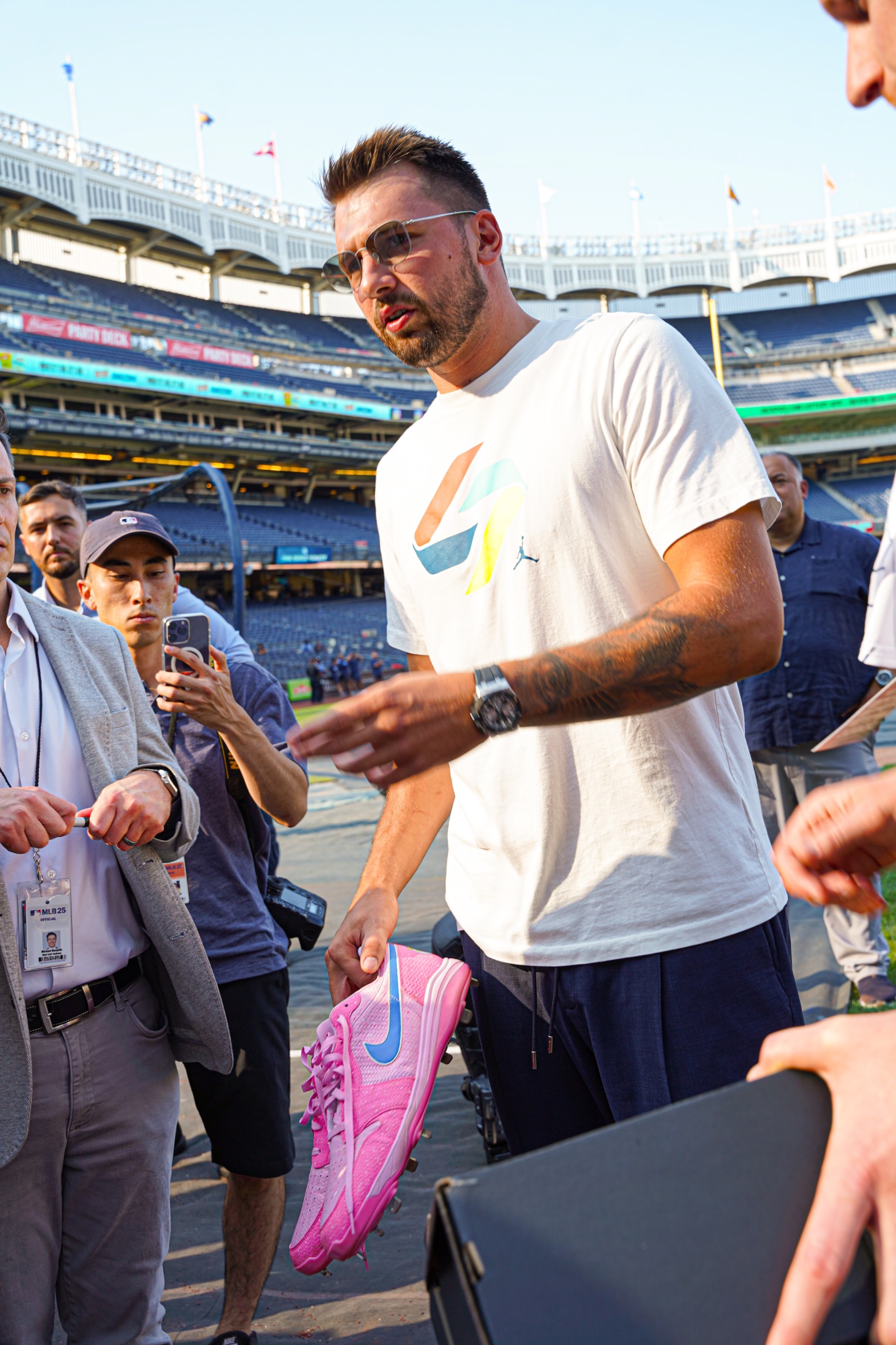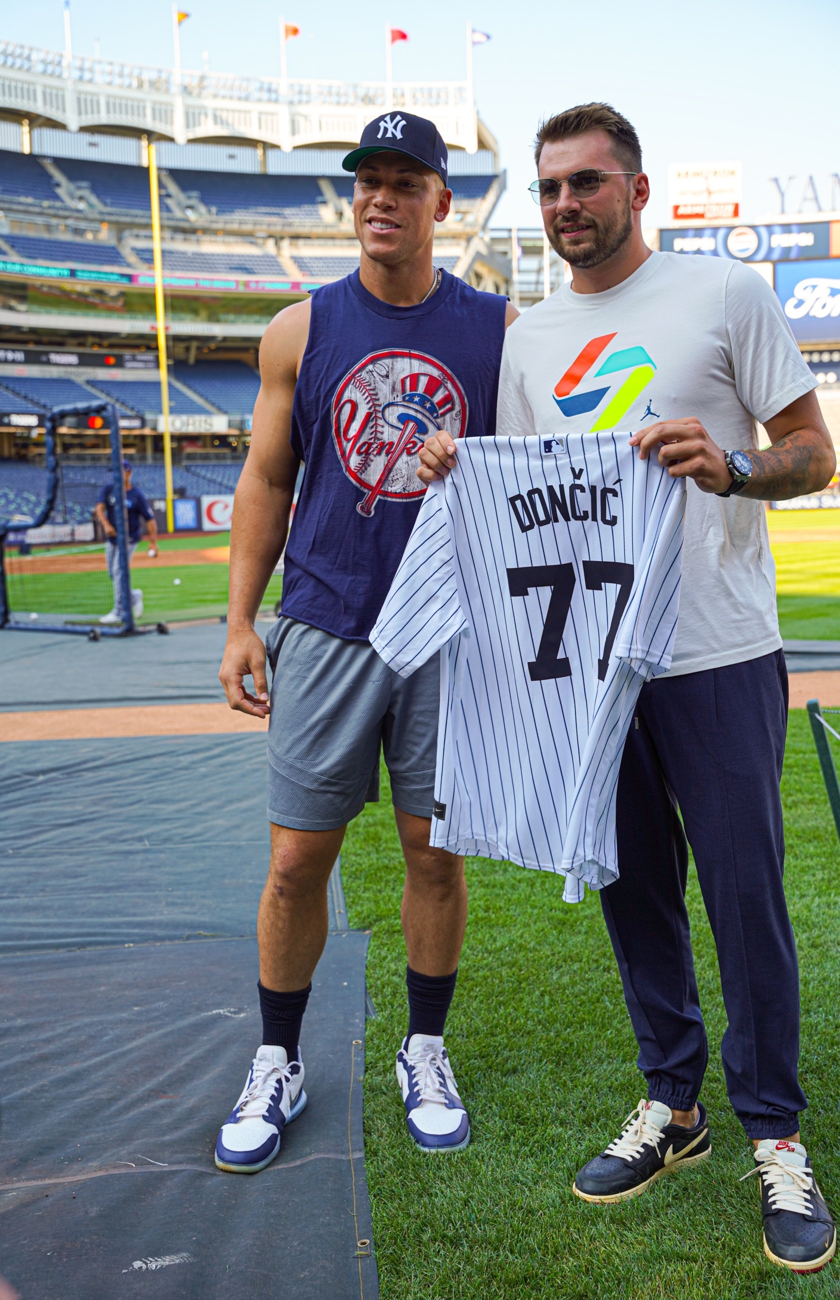 As it was Dončić’s first-ever visit to Yankee Stadium, Judge greeted him with a pair of his “Double Gum” AJ1 signed cleats, a game-used bat and a customized Dončić Yankee jersey with No. 77 embroidered on the back.