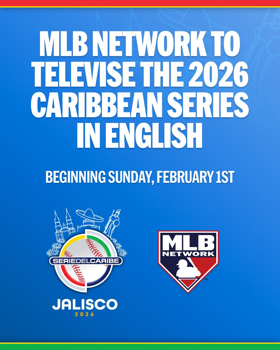 NEW YORK, NY — MLB Network announced Wednesday that it will televise the entire 2026 Caribbean Series in English beginning this Sunday, Feb. 1. Featuring teams from the Dominican Republic, Mexico, Panama and Puerto Rico, the 68th edition of this prestigious, international tournament will consist of 13 live games played across seven days at Estadio Panamericano in Zapopan, Jalisco, Mexico. MLB Network’s coverage presented by DirecTV begins with Mexico (Green) vs. Puerto Rico on Sunday, Feb. 1 at 2 p.m. ET, followed by Dominican Republic vs. Mexico (Red) at 8:30 p.m. ET. Two live games will be played each day from Feb. 2 through Feb. 6, with the Championship game scheduled for Saturday, Feb. 7, at 8 p.m. ET.