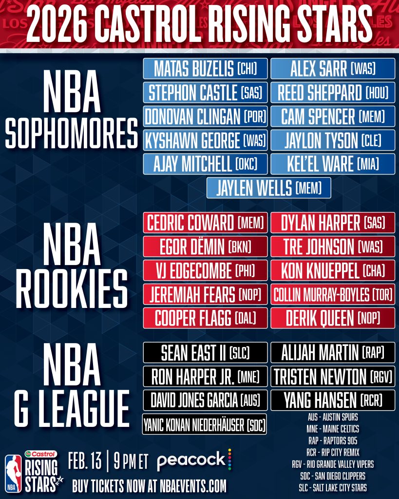 NEW YORK, NY — The NBA announced the 28 players selected to compete in the 2026 Castrol Rising Stars, the annual showcase of premier young talent at NBA All-Star.  The event will take place on Friday, Feb. 13 at Intuit Dome in Inglewood, Calif., streaming on Peacock at 9 p.m. ET/6 p.m. PT.  Tickets are available at NBAEvents.com via Ticketmaster.