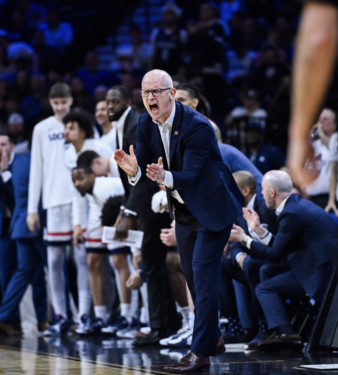 PHILADELPHIA, PA — When the clock struck 11:24 eastern standard time Sunday night, UConn head coach Dan Hurley howled his starting Huskies off the floor of Xfinity Mobile Arena, subbing out Malachi Smith, Solo Ball, Alex Karaban, Braylon Mullins and Tarris Reed Jr.
