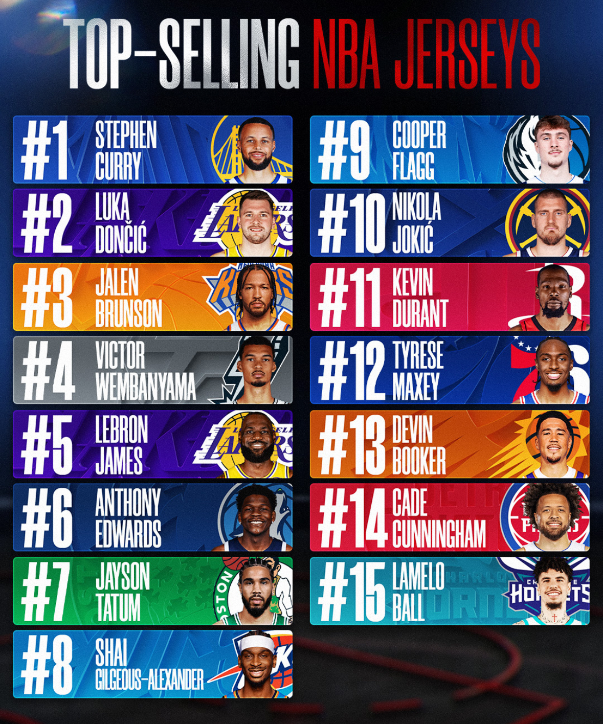 • Fourteen players on the Top-Selling Jersey list have qualified for the NBA postseason: No. 1 Stephen Curry (Golden State Warriors), No. 2 Luka Dončić (Los Angeles Lakers), No. 3 Jalen Brunson (New York Knicks), No. 4 Victor Wembanyama (San Antonio Spurs), No. 5 LeBron James (Los Angeles Lakers), No. 6 Anthony Edwards (Minnesota Timberwolves), No. 7 Jayson Tatum (Boston Celtics), No. 8 Shai Gilgeous-Alexander (Oklahoma City Thunder), No. 10 Nikola Jokić (Denver Nuggets), No. 11 Kevin Durant (Houston Rockets), No. 12 Tyrese Maxey (Philadelphia 76ers), No. 13 Devin Booker (Phoenix Suns), No. 14 Cade Cunningham (Detroit Pistons) and No. 15 LaMelo Ball (Charlotte Hornets).