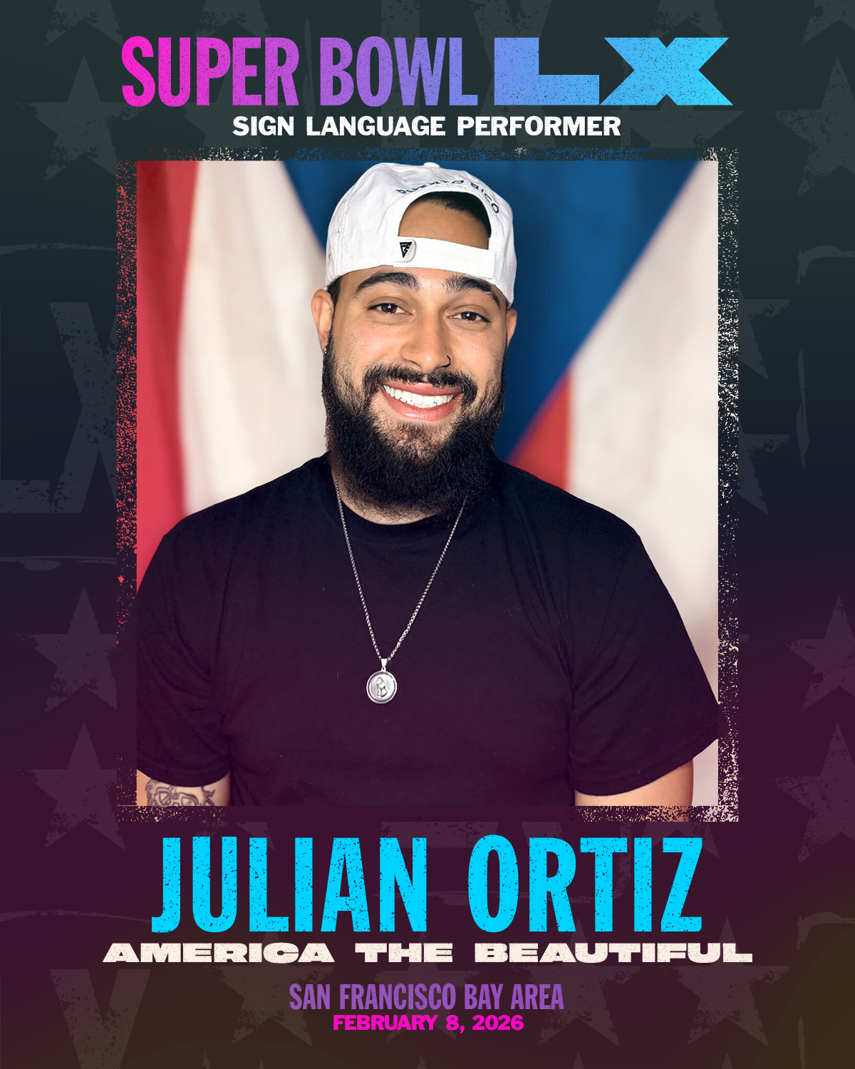 Julian Ortiz, delivering the ASL version of “America the Beautiful” at Super Bowl LX, is a proud Puerto Rican performer who embraces his Deaf identity with strength, confidence, and cultural pride. He celebrates the richness of both Deaf and Puerto Rican cultures through the power of music, bringing visibility, authenticity, and empowerment to every stage he enters. His work includes music performing at nationally featured Amazon livestream performances and at major festivals, where he works to elevate music artistry in sign language.
