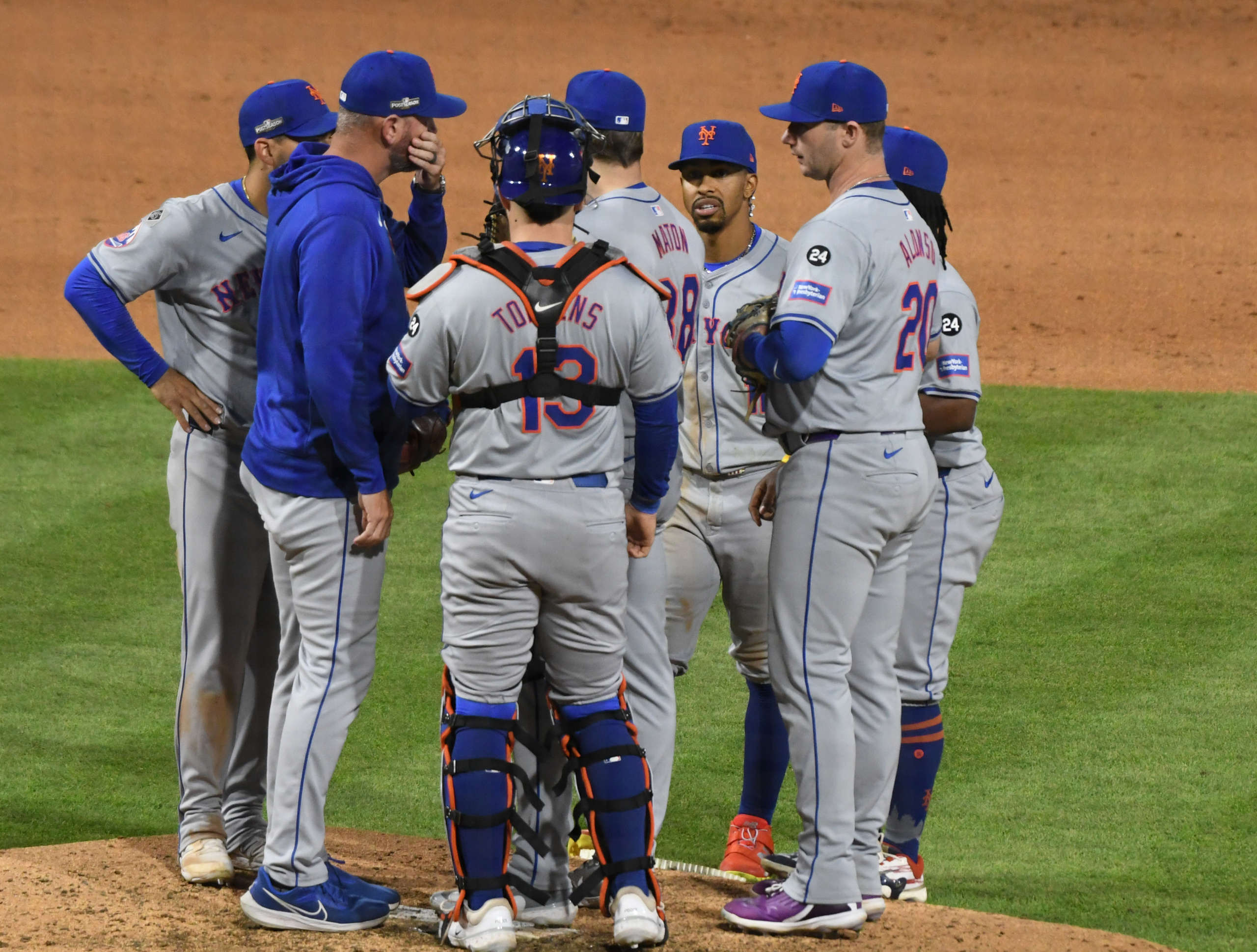Mets’ pitching coach Jeremy Hefner takes a mound visit during Game 1 of the NLDS against the Phillies – Image Credit: George Napolitano/Latino Sports