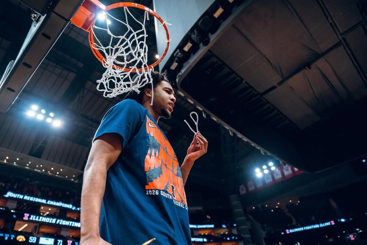 Brandon Lee cutting down the net last Sunday in Houston, Texas with his teammates and coaches as Illinois won the South Regional Final to punch their ticket to the Final Four – Image Credit: Illinois Men’s Basketball