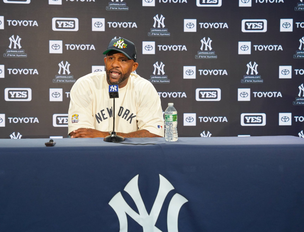 CC Sabathia speaking to the media this past Sunday afternoon at Yankee Stadium after throwing out the first pitch with his family alongside – Image Credit: Hector Beauchamp/Latino Sports