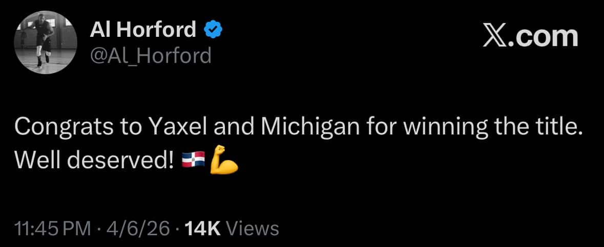 Al Horford’s congratulatory message to Yaxel Lendeborg and the Michigan Wolverines on X/Twitter Monday night following the program’s national championship win over UConn in Indianapolis at Lucas Oil Stadium – Image Credit: X/Twitter